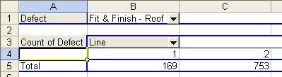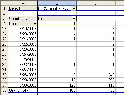 Drag the Date field from the PivotTable Field List to cell A4 in the image above. This will show the data by day. As you scroll through this data, you will see that there were 1-2 problems a day on line 2 throughout the month, but on August 28, something happened to send the defects through the roof.