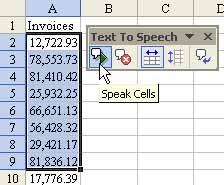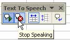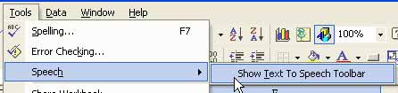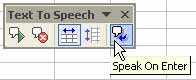 Then, in Excel, go to Tools – Speech – Show Text to Speech Toolbar.
