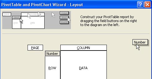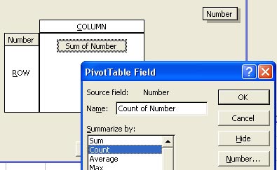 Drag the Number button to the Data area and it will appear as "Sum of Number". Instead of summing, you want to find a count of how many times each number has appeared. In the Layout dialog, double-click the Sum of Number button to display the PIvotTable Field dialog. In that dialog, choose to Summarize by Count.