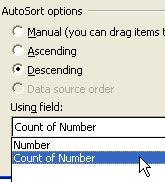 You would like to have the report presented with the most popular numbers at the top. Double click the Number field in the Row area of the Layout dialog. This will present a different version of the PivotTable Field dialog. Choose the Advanced button.