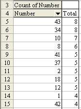 Click OK three times to return to the Pivot Table Wizard step 3. Click Finish. The resulting pivot table shows that the numbers 43 and 34 have come up far more than the average number. If you believe that numbers can be hot, you might want to play 43, 34, 10, 8, 41, and 37.
