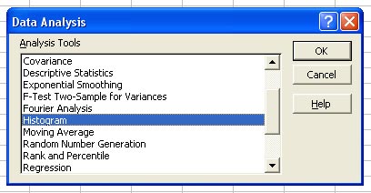 From the menu, select Tools - Data Analysis - Histogram. Fill out the dialog as shown here.