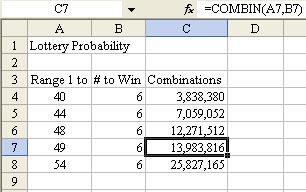 Finally, is it even a good deal to play the lottery? Use the =COMBIN() function to find out. The Ontario lottery requires you to select 6 numbers out of a pool of 49 numbers. The formula in C7 is =COMBIN(49,6) and shows that there are 13,983,816 possible results. Thus, if the lotto jackpot is greater than 14 million as a cash option, then your payout would exceed the odds.