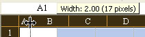 Next, grab the line between the "A" and "B" above the first two columns. Drag it to the left. As you drag, the tooltip will show the width of the column. When you get to 17 pixels, release the mouse button.