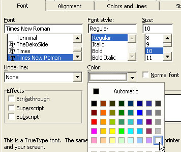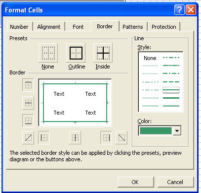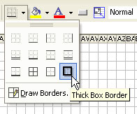 Or, if you want more flexibility than the 12 common styles, use Format - Cells and choose the Borders tab in the Format Cells dialog. This dialog allows you to change the color of the borders and offers a variety of line thickness.