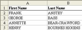Most people think that Excel is just for calculating numbers. It also has a great variety of calculations and functions for managing text as well. Here is an Excel spreadsheet with first name in column A and last name in column B.