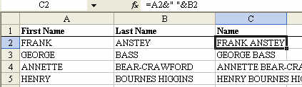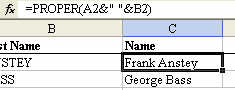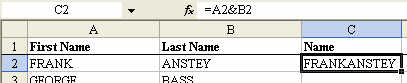 This is close – but it gives a name of FRANKANSTEY instead of FRANK ANSTEY. Edit the formula to be =A2&" "&B2. Double click the fill handle to copy the formula down.