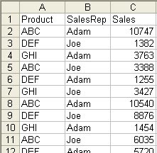 Here is an Excel worksheet with columns for product, sales rep and sales. The data is in cells A2:C29.