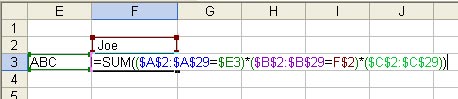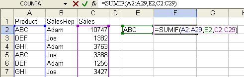 You would then assume that it is possible to figure out the total sales of product ABC made by Joe. However, there is no way to do this with the SumIf function. It turns out that you need to use a fairly complex array or CSE formula.