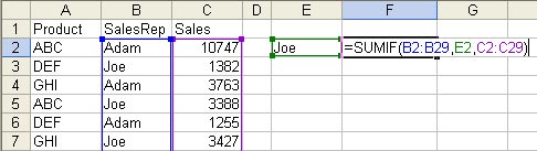 It is also easy to figure out the total of sales made by sales rep Joe with =SUMIF(B2:B29,E2,C2:C29).