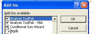 The good news - Microsoft offers the Conditional Sum Wizard which allows even a novice to enter complex conditional formulas based on 1, 2 or more conditions. The Conditional Sum Wizard is an add-in. To add this functionality to Excel, go to the Tools menu and select Add-Ins. In the Add-Ins dialog box, choose the checkbox next to Conditional Sum Wizard and choose OK. It is possible that you might need your installation CD at this point, because Microsoft does not include the wizard in the default install.