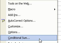 Once the add-in is successfully turned on, there will be a Conditonal Sum... choice near the bottom of the Tools menu.