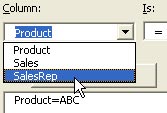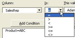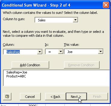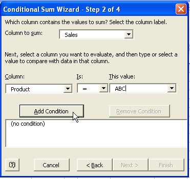 In step 2, select the column to sum. In this case, the wizard already guessed you want to sum the first (and only) numeric column - Sales. In the middle of the dialog box are three dropdown controls. These happen to be correct for the first condition - Product equals ABC, so choose the Add Condition button.