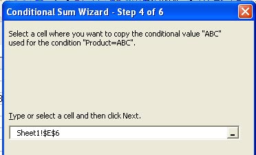 In step 3, you have two choices. In the first choice, the Wizard will enter a single formula with the values "ABC" and "Joe" hardcoded into the formula. It will give you the answer, but there will be no opportunity to easily change the formula. With the second choice, Excel will set up a new cell with the value "ABC" and a new cell with the value "Joe". A third cell will contain the formula that does a conditional sum based on those two values. With this option, you could type new values into the cells in order to see the total XYZ's sold by Adam.