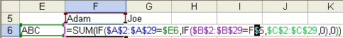 Additional Information: If you want to build a table that will show sales of each product by each sales rep, there is some special "care and feeding" that you will need to know about these formulas. Type each sales rep across the top of the range. Type each product down the left column of the range. Edit the formula provided by the wizard. In the image below, the formula is pointing a the product in cell E6. This reference really needs to be $E6. If you leave the reference as E6 and copy the formula to column G, the formula would look at F6 instead of E6 and this would be wrong. Adding a dollar sign before the E in E6 will make sure that the formula always looks at the product in column E. The formula is also pointing to a sales rep in cell F5. This reference really needs to be F$5. If you left the reference as F5 and copy down to row 7, the F5 reference will change to F6 and this is not right. Adding a dollar sign before the row number will lock the row number and the reference will always point to row 5.