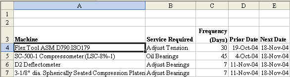 Here is an Excel worksheet with all of the scheduled tasks that have to be completed at a department. The worksheet lists a piece of equipment, the maintenance to be performed, how often it should be performed, and the next due date.