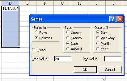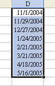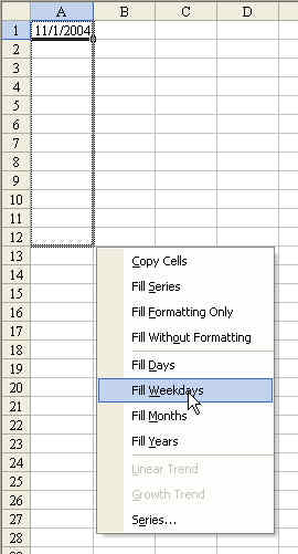 Here is a cool trick for entering the days of the work week. Enter a date in a cell. Right-click the fill handle of the cell, drag, release the mouse, and choose Fill Weekdays.
