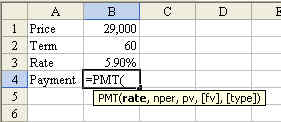 The function to calculate a loan payment is =PMT(). I can never remember the order of the arguments for this function. That is OK - the Excel Function Wizard can help you to enter the function successfully. In cell B4, start to enter the function: =PMT(