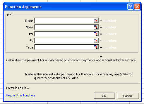 In Excel 2002 or later, the tooltip will appear showing all of the required arguments. Sometimes, though, the arguments can appear rather cryptic. What is PV and nper? After typing the opening paretheses for the function, hit Ctrl + a. The Function Wizard will appear.