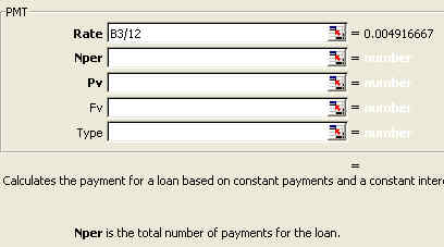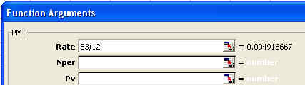 The Function Wizard shows each parameter. Parameters shown in bold such as Rate, Nper, Pv are required. Parameters shown not in bold are optional. When you click into each field, the bottom of the function wizard tells you more about the parameter. In the image above, you can see that Rate is the interest rate for the period. Their example says to use 6%/4 for quarterly payments. Since we have monthly payments, we want to use B3/12. With the mouse, touch cell B3. Type /12.