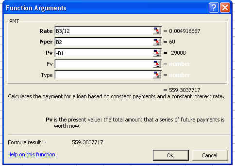 This is the non-intuitive part. Since you are borrowing money from the bank, you will be $29,000 in debt. Type an negative sign and touch cell B1. You can now see that Excel offers a provisional solution of $559 in the bottom of the wizard.