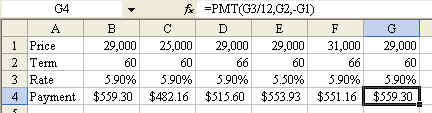 Now that you have the range of B1:B4 working, copy those cells and paste several times in columns C through F. Change the prices, terms, or interest rates to see the effect on the payment.