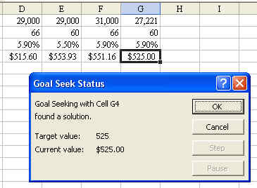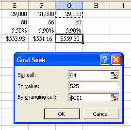 What if you know that you want your payment to be $525? You can use the Goal Seek function. Put the cell pointer in cell G4. From the menu, select Tools - Goal Seek. In the dialog box, say that you want to set cell G4 to $525 by changing the price of the car in G1.