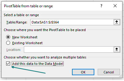 If you want a pivot table showing you the top five customers but the total from all customers, you have to move your data outside Excel. If you have Excel 2013 or newer running in Windows, there is a very convenient way to do this. To show you this, I've deleted the original pivot table. Choose Insert, Pivot Table. Before clicking OK, select the checkbox Add This Data To The Data Model.
