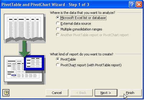 In the Pivot Table Wizard step 1, click Finish to accept all of the defaults.