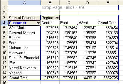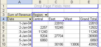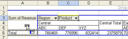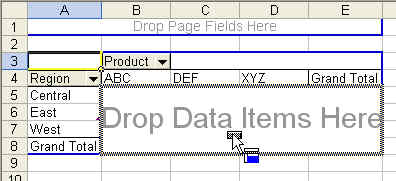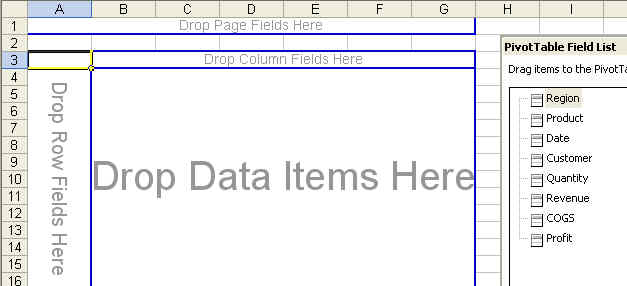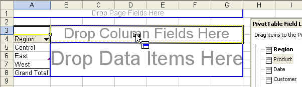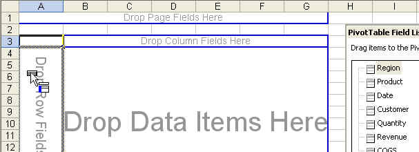 Let's say that your manager wants a report of Revenue by Region and Product. Drag the region field from the field list and drop it in the Row Fields Here section. Note that when the mouse is in the correct location, the mouse pointer will change to show the blue bar on the extreme left of the pivot table.