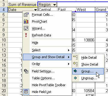In the image above, you have a report by day. Outside of the manaufacturing plant, not many people need to see data by day. Most want a summary by month. Here is the secret way to change the daily report into a monthly report. First, right-click the Date field tab. Choose Group and Show Detail and then Group.