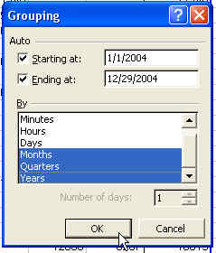 In the Grouping dialog, choose months, quarters and years. Click OK.
