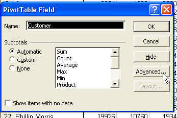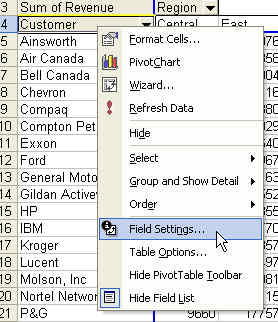 Drag the customer field to the pivot table so you have a report of all customers. If you are producing a report for the Vice President, he may not care about the entire list of customers. He might want to just see the top 10 or top 5 customers. To begin, right click the grey customer field. Choose Field Settings.
