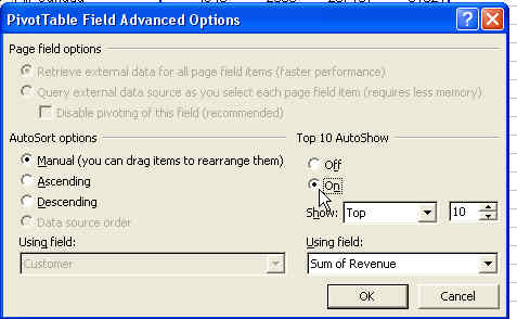 On the right side of the Pivot Table Field Advanced Options dialog is the Top 10 Autoshow feature. Choose the radio button for On. If you wish, change to show the top 5 or 15.