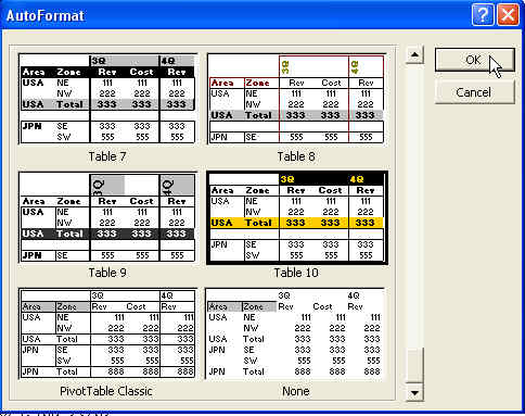 If you try to format a pivot table and then pivot it, your formatting may be lost. The pivot table toolbar offers a special Autoformat button. Choose this button as shown