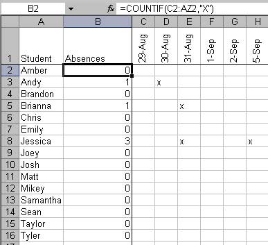 When someone is absent, enter an "X" in the appropriate date. Column B will total the absences.