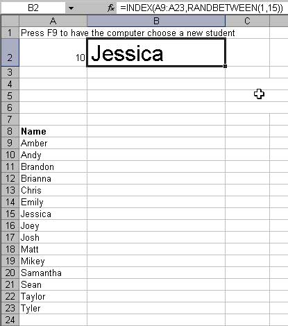 =INDEX(A9:A23,RANDBETWEEN(1,15)). Note that the "15" should be changed to the number of your students. Also, A9:A23 should reflect the actual range where you typed your students.