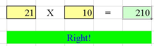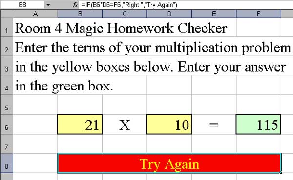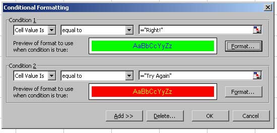 =IF(B6*D6=F6,"Right!","Try Again") - Choose B8. Use Format - Conditional Formatting. Choose Cell Value Is, Equal To, Type "Right!". Click the Format button. Choose blue as the color on the Font tab and Green as the color on the Pattern Tab. Click OK to close the Format dialog. Click Add to add a second condition.