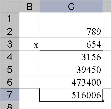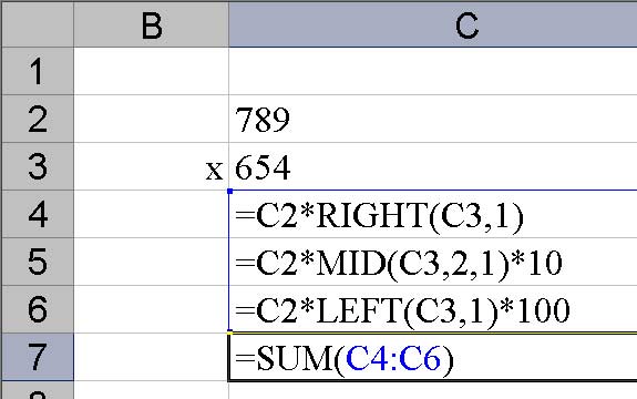 In the last example, the student enters the problem in C2 and C3. Formulas in C4:C7 build the answer. Here is how the worksheet looks: